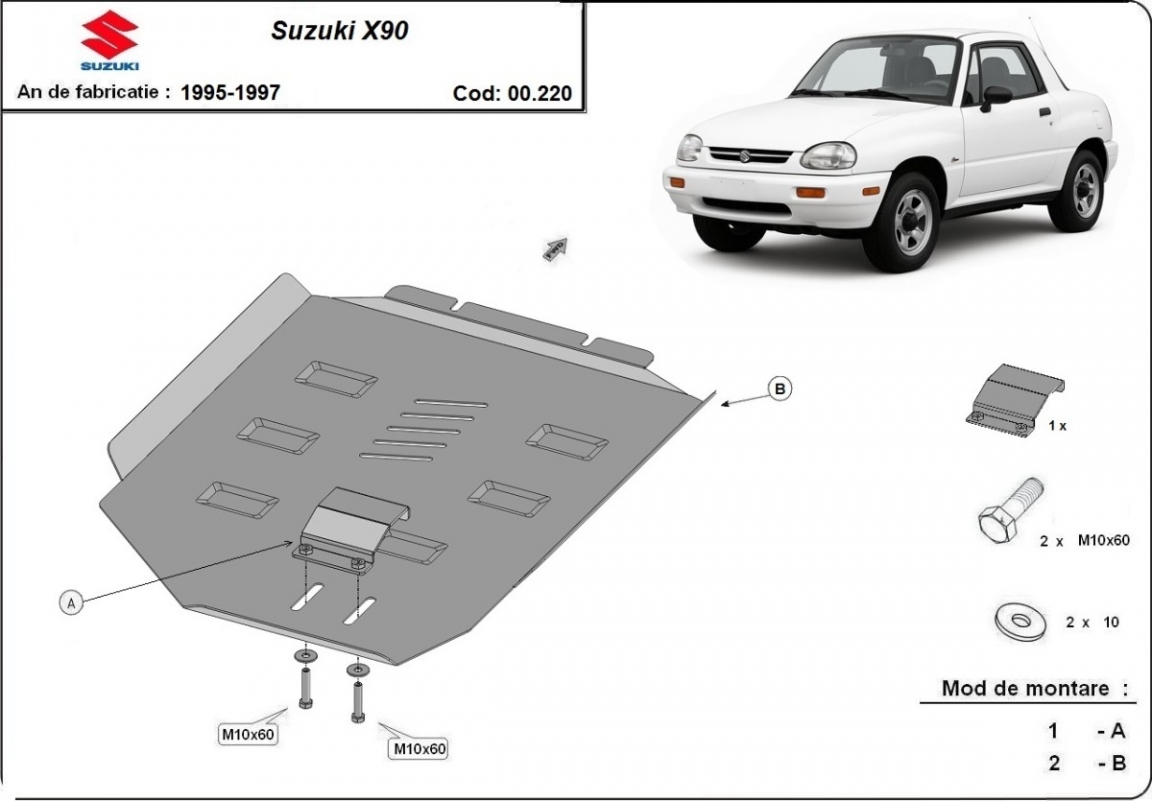 El cubre carter metalico es nuevo y se adapta perfectamente a todas las versiones de Suzuki X90 fabricadas entre 1988 y 1999. La placa protega los siguientes: caja de cambios Está preparado de chapa de Acero de 3 mm. Cerrojos, calces y todos los accesorios incluidos. Todas las placas son estrachadas con pintura de polvo anticorrosivo. Las placas del protección del motor son equipados con braceares soldados para resistir mejor a los impactos exteriores. |