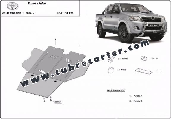 El cubre carter metalico es nuevo y se adapta perfectamente al Toyota Hilux, con las siguientes versiones de motor / accionamiento: toate, fabricado entre 2004 y 2015. La placa protega los siguientes: caja de cambios, diferencial, filtro de partículas Está preparado de chapa de Acero de 3 mm. Cerrojos, calces y todos los accesorios incluidos. Todas las placas son estrachadas con pintura de polvo anticorrosivo. Las placas del protección del motor son equipados con braceares soldados para resistir mejor a los impactos exteriores. |