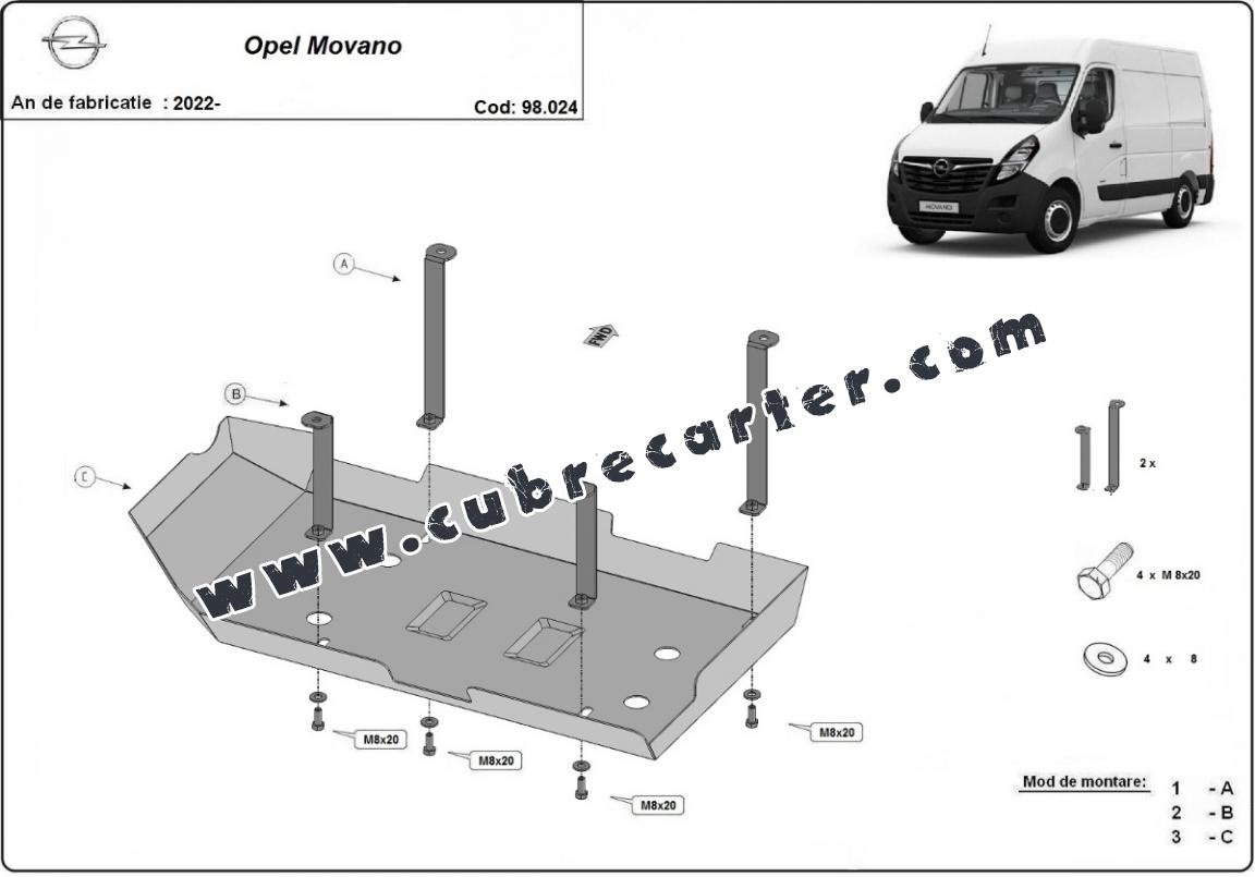 El cubre carter metalico es nuevo y se adapta perfectamente al Opel Movano, con las siguientes versiones de motor / accionamiento: toate, fabricado entre 2022 y 2025.