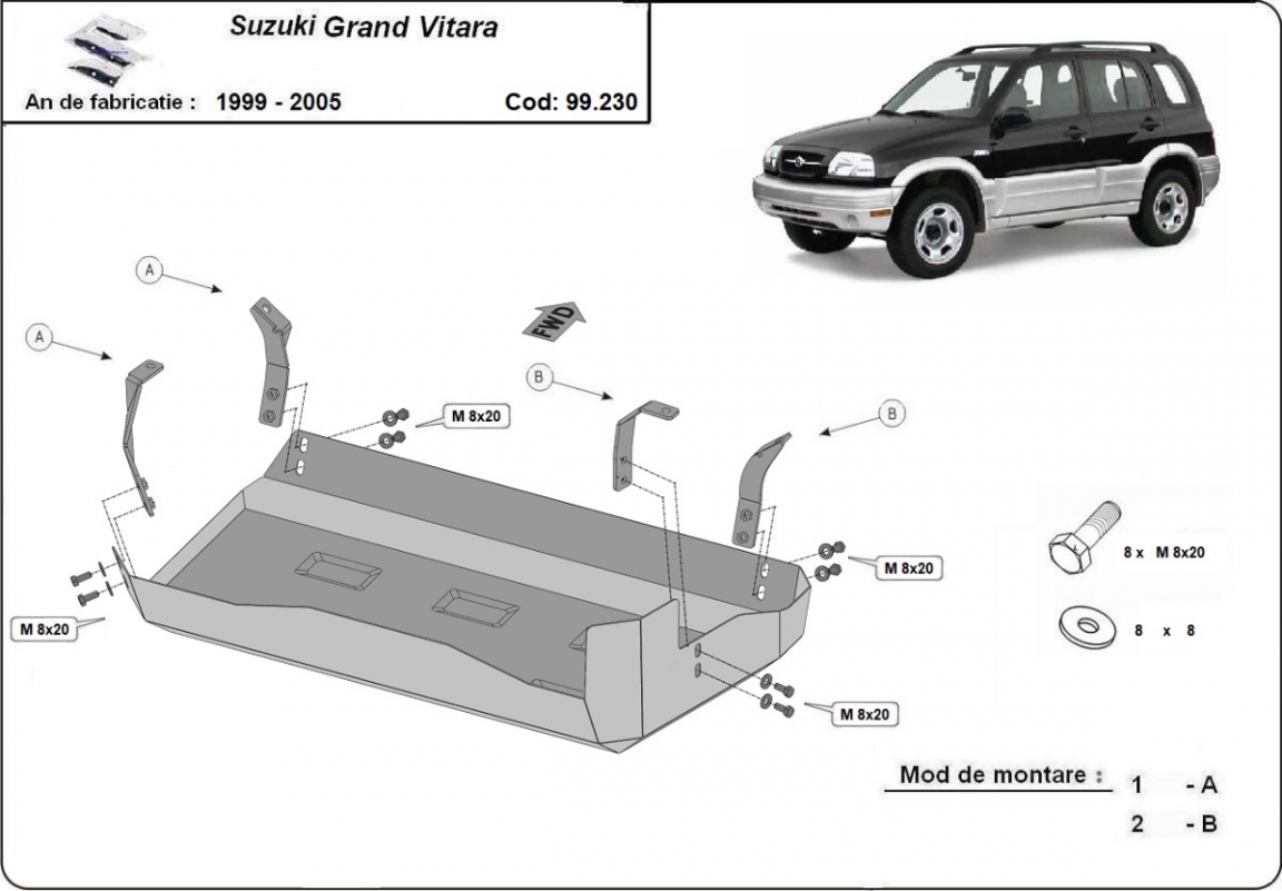 El cubre carter metalico es nuevo y se adapta perfectamente a todas las versiones de Suzuki Grand Vitara fabricadas entre 1999 y 2005. La placa protega los siguientes: depósito de combustible Está preparado de chapa de Acero de 2 mm. Cerrojos, calces y todos los accesorios incluidos. Todas las placas son estrachadas con pintura de polvo anticorrosivo. Las placas del protección del motor son equipados con braceares soldados para resistir mejor a los impactos exteriores. |