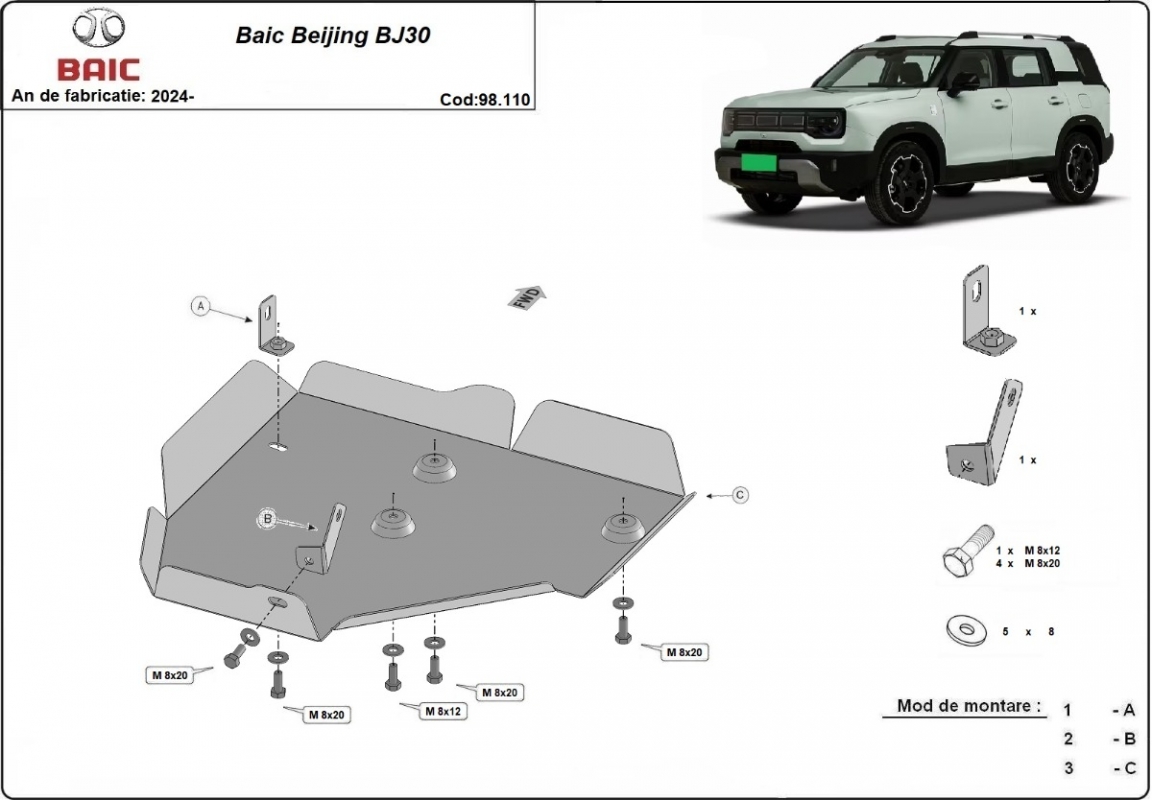 El cubre carter metalico es nuevo y se adapta perfectamente a todas las versiones de Baic Beijing BJ30 fabricadas entre 2024 y 2026. La placa protega los siguientes: diferencial trasero Está preparado de chapa de Acero de 2 mm. Cerrojos, calces y todos los accesorios incluidos. Todas las placas son estrachadas con pintura de polvo anticorrosivo. Las placas del protección del motor son equipados con braceares soldados para resistir mejor a los impactos exteriores. |